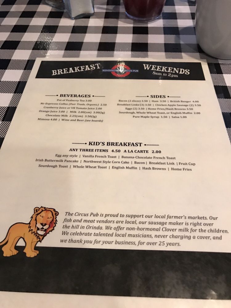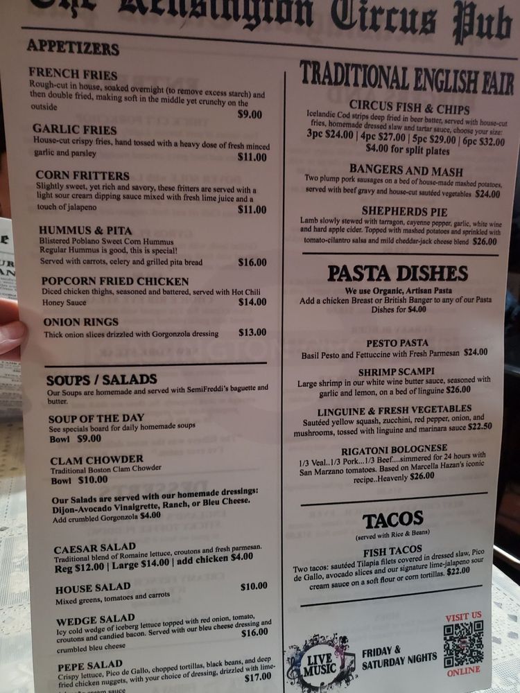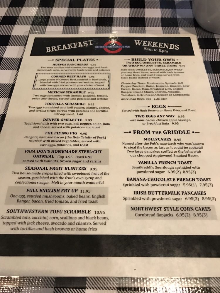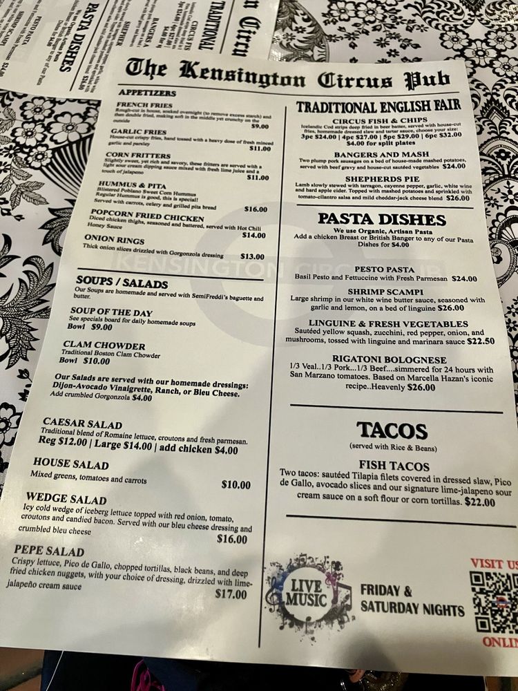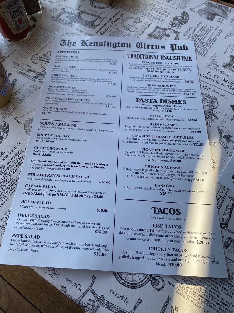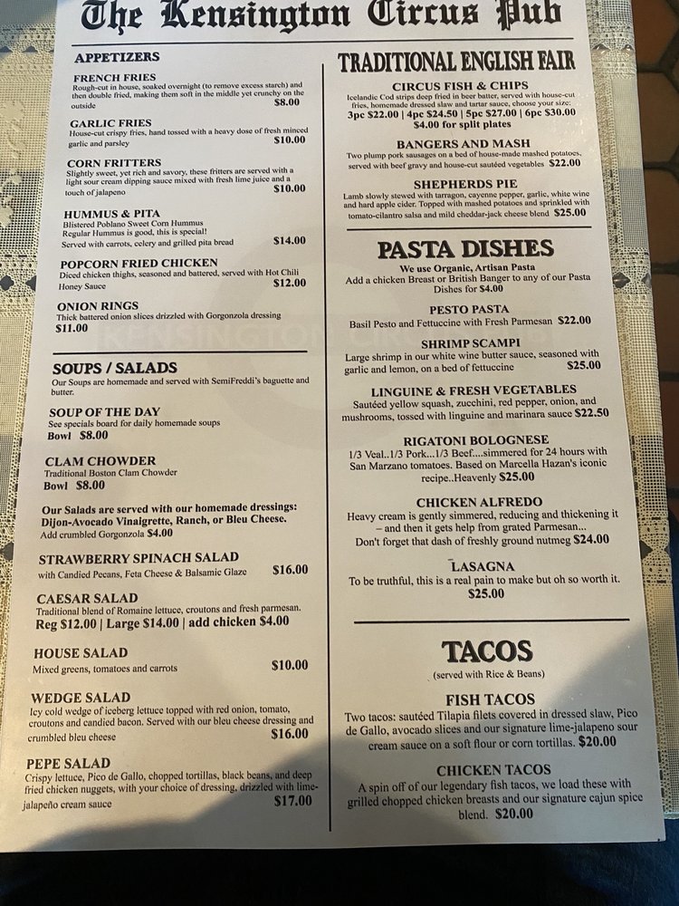 Kensington Circus Pub Menu