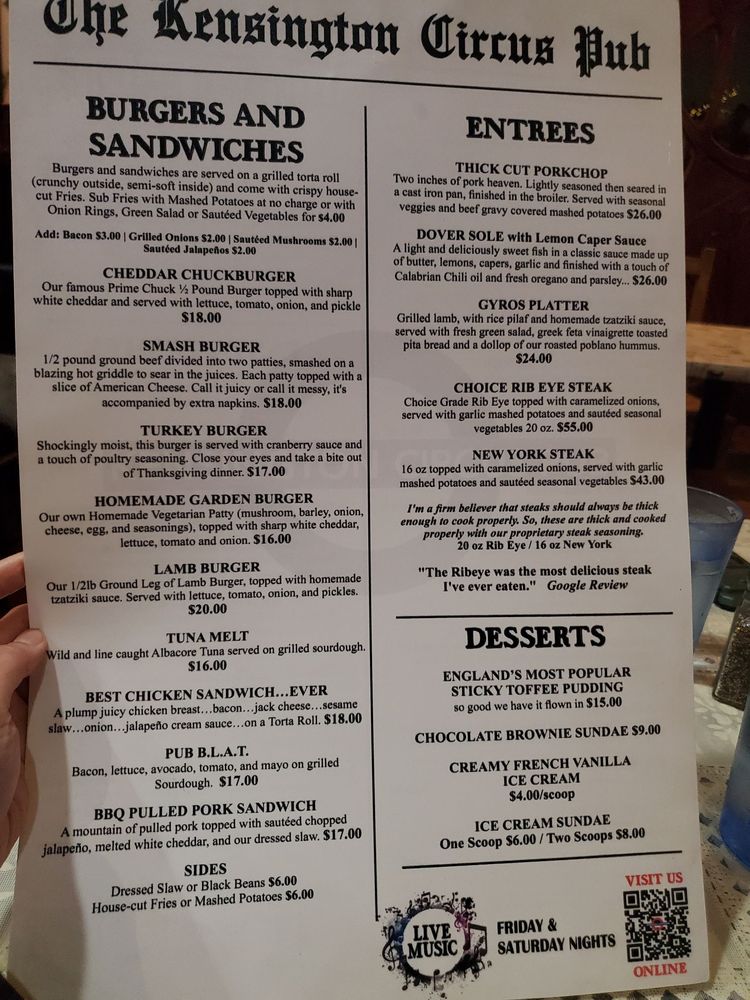 Introducing Kensington Circus Pub, a lively and welcoming English-style pub in Kensington, CA. Known for its warm atmosphere and friendly staff, this pub offers a variety of hearty dishes and an extensive beer selection. Customers rave about the generous portion sizes, flavorful steaks, and mouthwatering pork chops. The menu also includes favorites like fish and chips, corn fritters, and clam chowder. With live music nights, TV screens for sports fans, and a cozy bar area, there's something for everyone at this hidden gem. The attentive service, consistent quality, and diverse menu options make Kensington Circus Pub a must-visit spot for locals and visitors alike. Don't miss out on their famous sticky toffee pudding for a sweet ending to your meal. Experience the charm and community atmosphere of this neighborhood pub on your next visit.